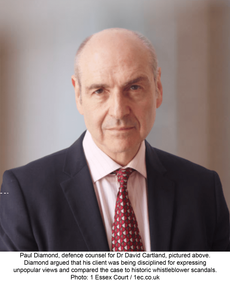 Over two weeks of hearings, Barrister Paul Diamond attempted to downplay Dr Cartland’s conduct, describing it as “pub talk online” and arguing that Twitter was simply a “nasty place” where harsh words shouldn’t be taken too seriously. But in defending his client, Diamond made a series of statements that some observers argue did more to support the General Medical Council’s (GMC) case than refute it.