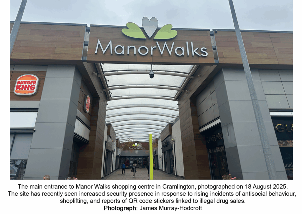 QR code stickers linking to illegal drug-selling websites have been spotted around Manor Walks shopping centre in Cramlington, sparking fresh concerns about youth safety, retail crime, and increasingly sophisticated tactics used by dealers.