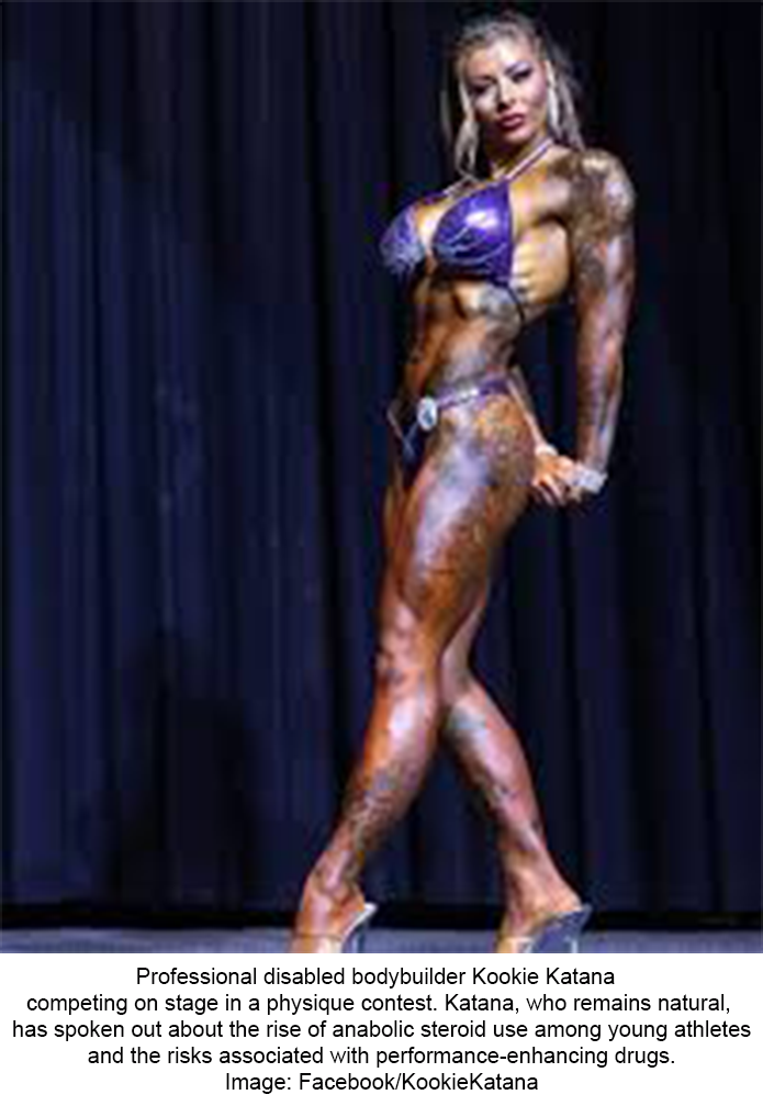 Professional disabled bodybuilder Kookie Katana said she has witnessed a rise in steroid use among both men and women in gyms and on stage. Although she competes naturally, she has trained alongside many who use steroids and has seen the side effects first-hand.