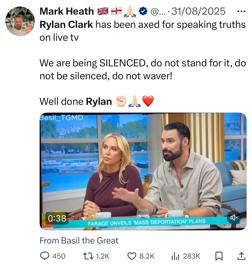 A social media post claiming Rylan Clark was “axed for speaking truths” after comments on immigration during ITV’s This Morning, 31 August 2025. The broadcaster has not confirmed any such dismissal, but the clip has fuelled heated debate online. Image: X.com