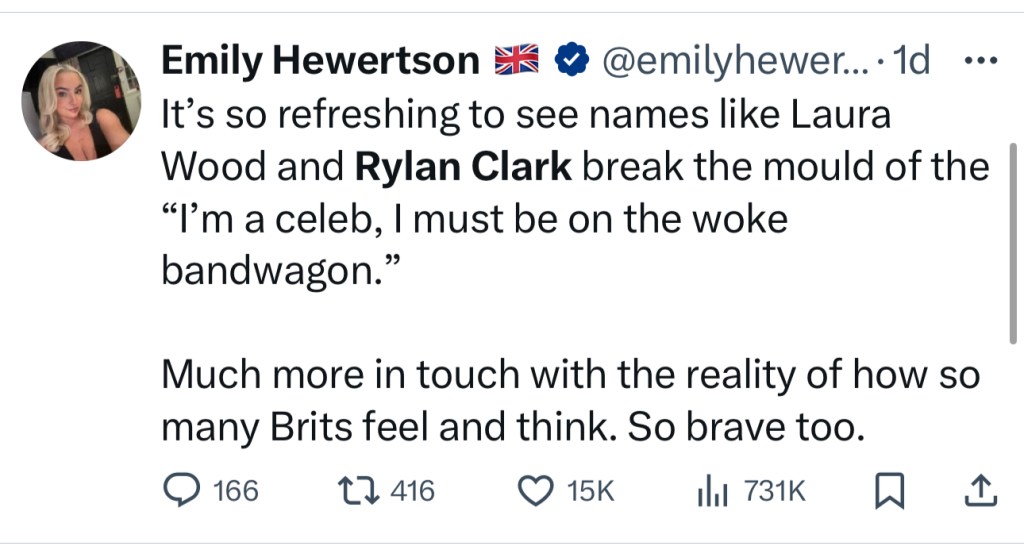 A social media post praising Rylan Clark and presenter Laura Wood for “breaking the mould” following Clark’s comments on immigration during ITV’s This Morning. The post suggested the pair were more in touch with public opinion than other celebrities. Image: X.com